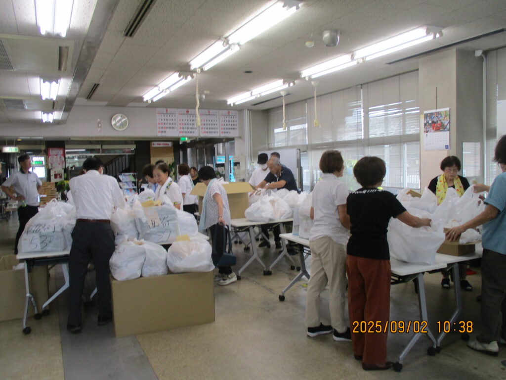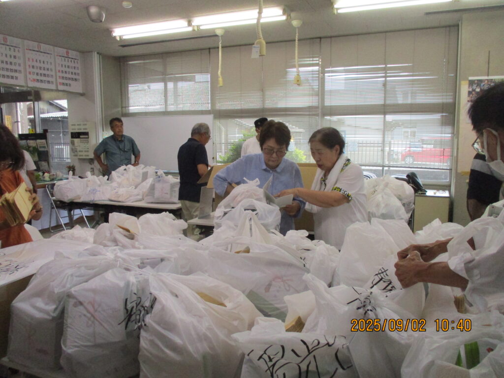 福祉部会では9月2日(火)午前、敬老対象者2072名分のお祝い品を各自治会ごとに仕分けしました。午後からはこれを各自治会の福祉員に配布し、福祉員等を通して対象者全員にお祝いの品を贈りました。